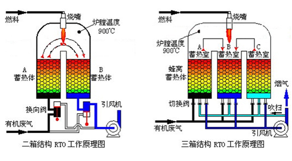 两床RTO主体结构由高温氧化室、两个陶瓷蓄热体和四个切换阀门组成。当有机废气进入蓄热体1后, 蓄热体1放热,有机废气被加热到800℃左右后在高温氧化室燃烧,燃烧后的高温洁净气体通过蓄热体2;蓄热体2吸热,高温气体则被蓄热体2冷却后,经过切换阀排放。经过一段时间,阀门切换,有机废气从蓄热体2进入,蓄热体2放热加热废气,废气被氧化燃烧后通过蓄热体1,蓄热体1吸热,高温气体被冷却后通过切换阀排放。这样周期性地切换,就可连续处理有机废气,同时无需或少量补充能量,达到节能效果。